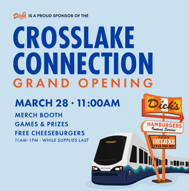 Dick’s Drive-In will be at Judkins Park Station with prizes, merch, and one FREE Cheeseburger for Sound Transit and Drive-In Fan to celebrate the big day!